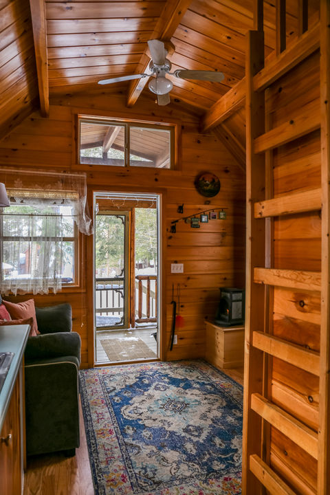 The bedroom has a twin size and a full size bunk built into the room. There is also an upper loft with extra space to sleep or relax.